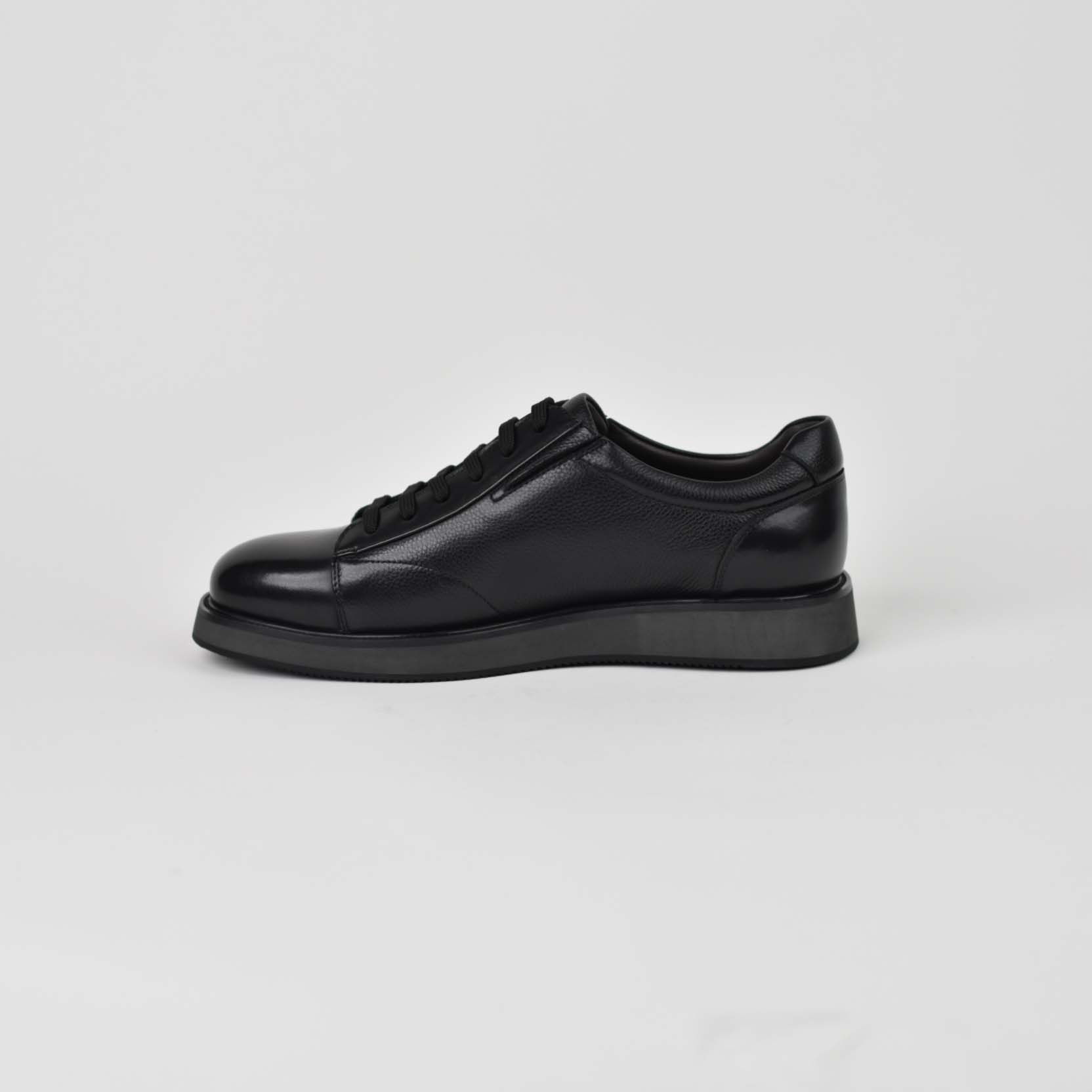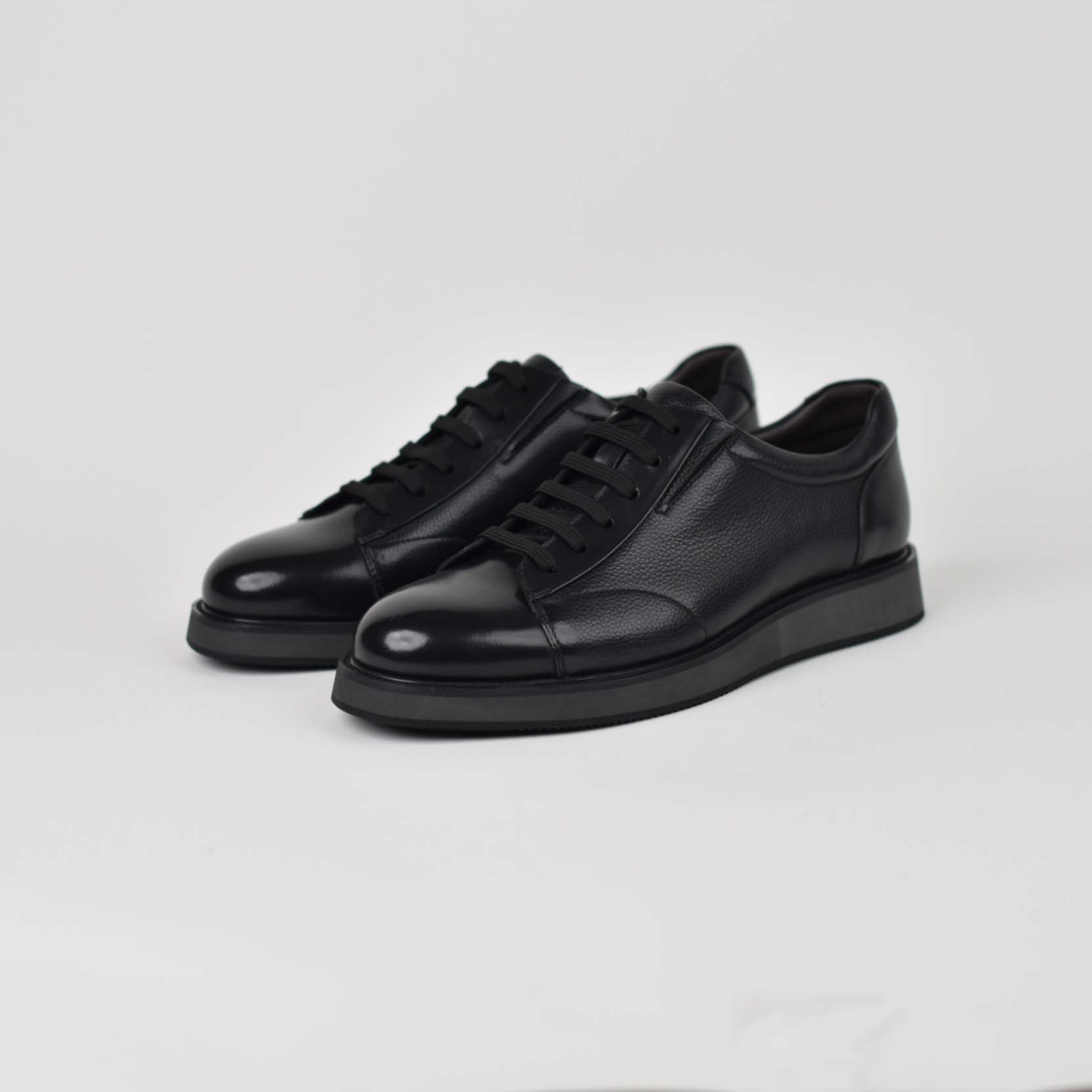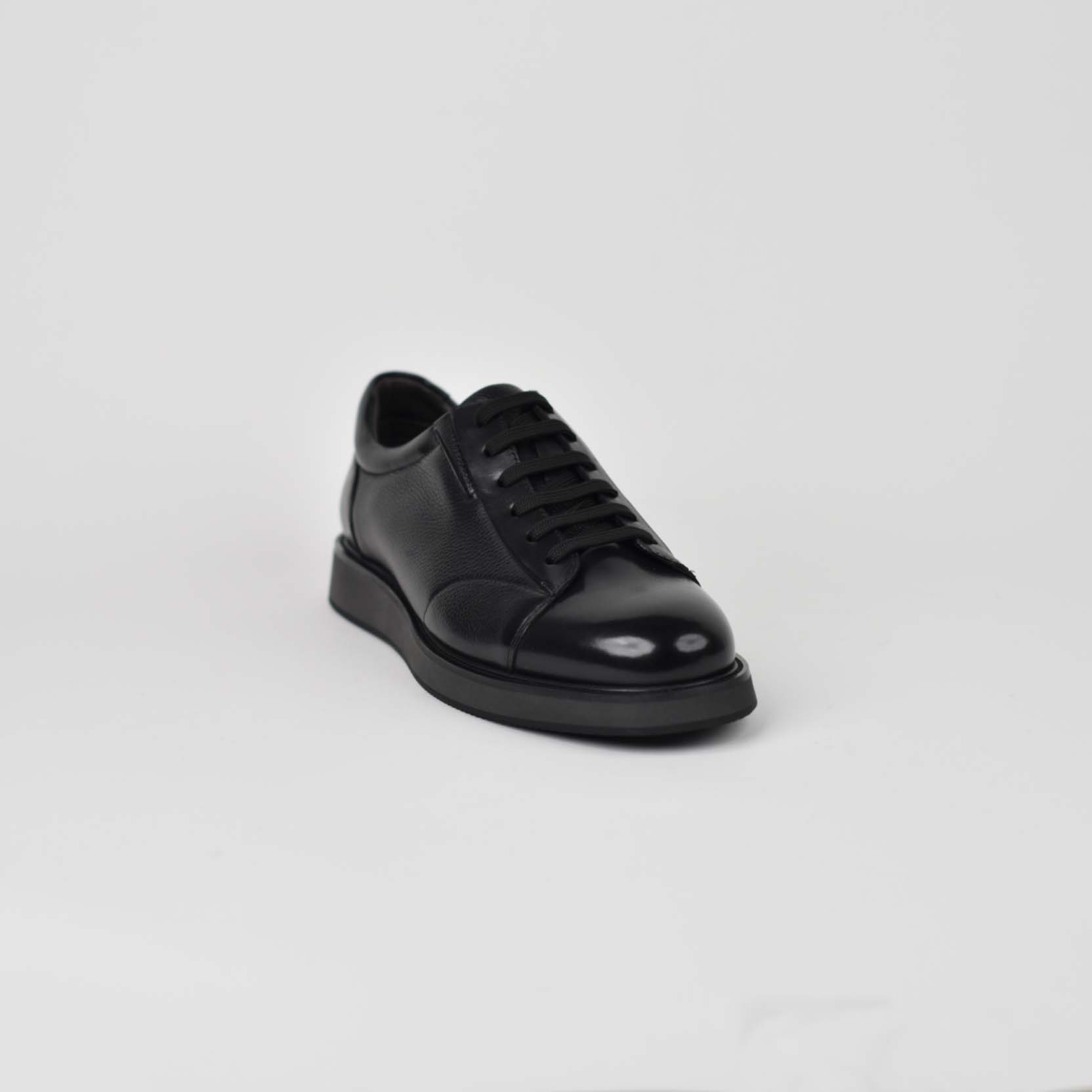 Këto këpucë elegante për meshkuj janë një kombinim perfekt i stilit klasik dhe rehatisë moderne. Të punuara nga lëkurë cilësore, ato ofrojnë një përfundim të lëmuar dhe shkëlqim të sofistikuar në pjesën e përparme, ndërsa anët me teksturë i japin një pamje të rafinuar dhe bashkëkohore. Modeli me lidhëse të zeza siguron qëndrueshmëri dhe përshtatje të saktë, ndërsa tabani i sheshtë dhe i përforcuar garanton komoditet dhe mbështetje gjatë gjithë ditës.