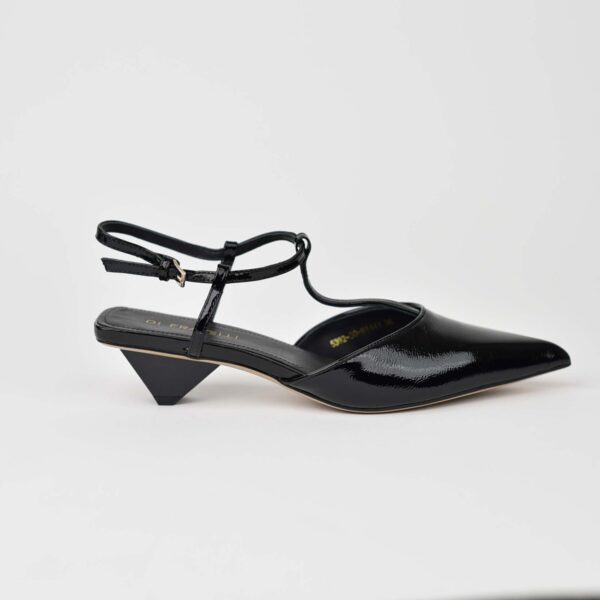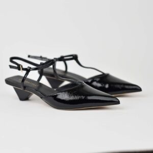 Hijeshia e natës – Këpuca e zezë me shkëlqim dhe takë të ulët asimetrike