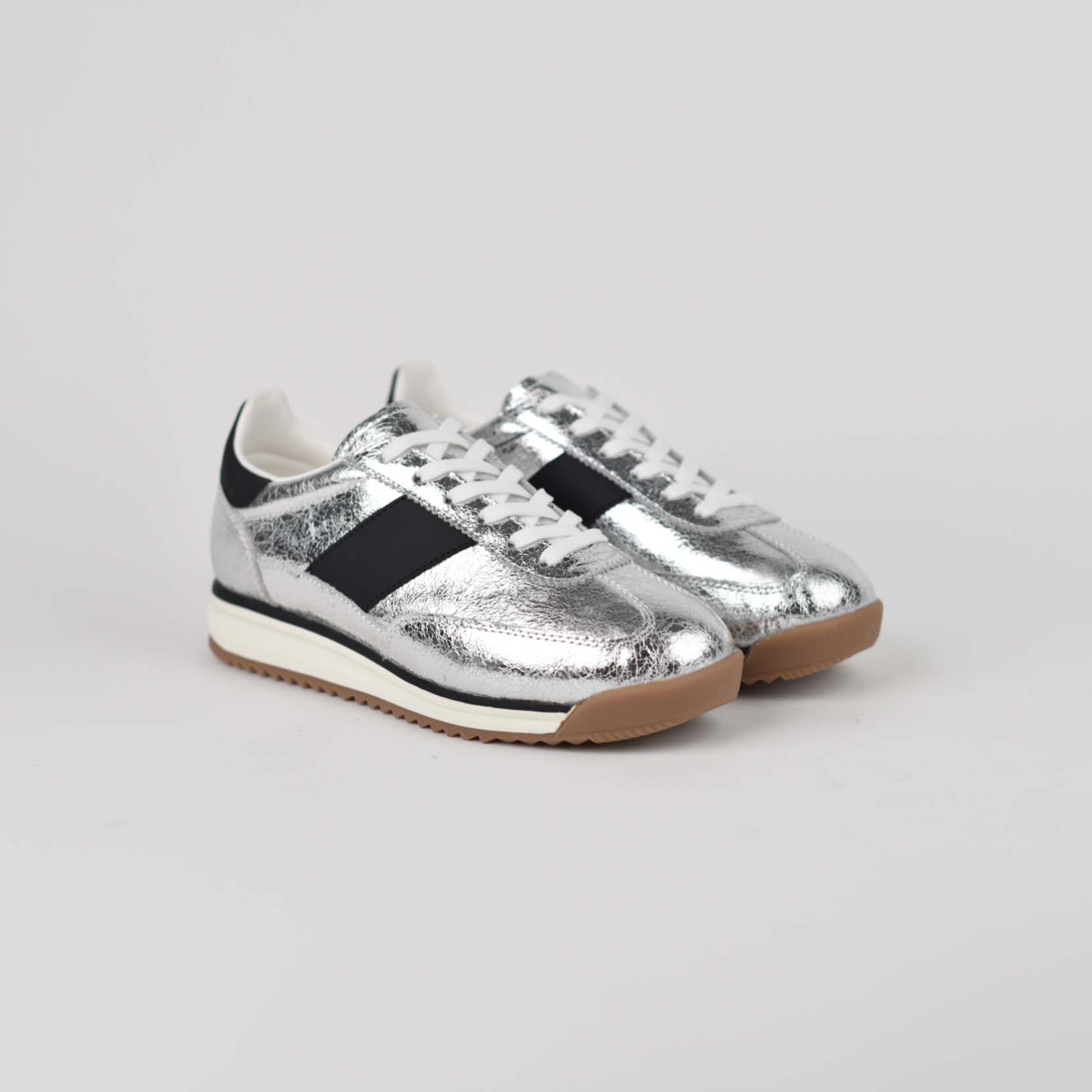 Model unik që bashkon energjinë urbane me finesën moderne. Këto sneakers në lëkurë natyrale me efekt metalik argjendi janë idealë për vajzat që duan të dallohen. Pjesa e sipërme reflekton dritën me shkëlqim elegant, ndërsa detaji anësor në ngjyrë të zezë sjell kontrast të sofistikuar.