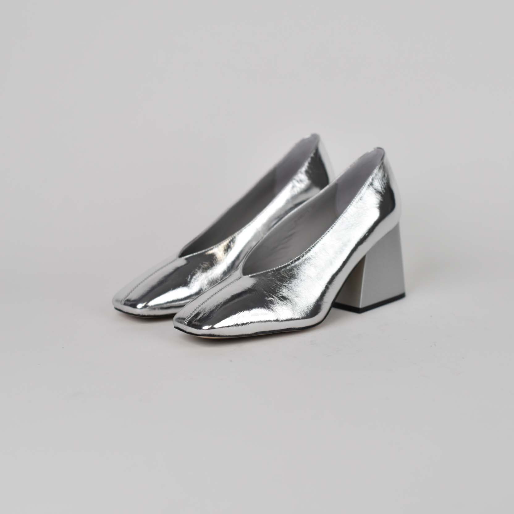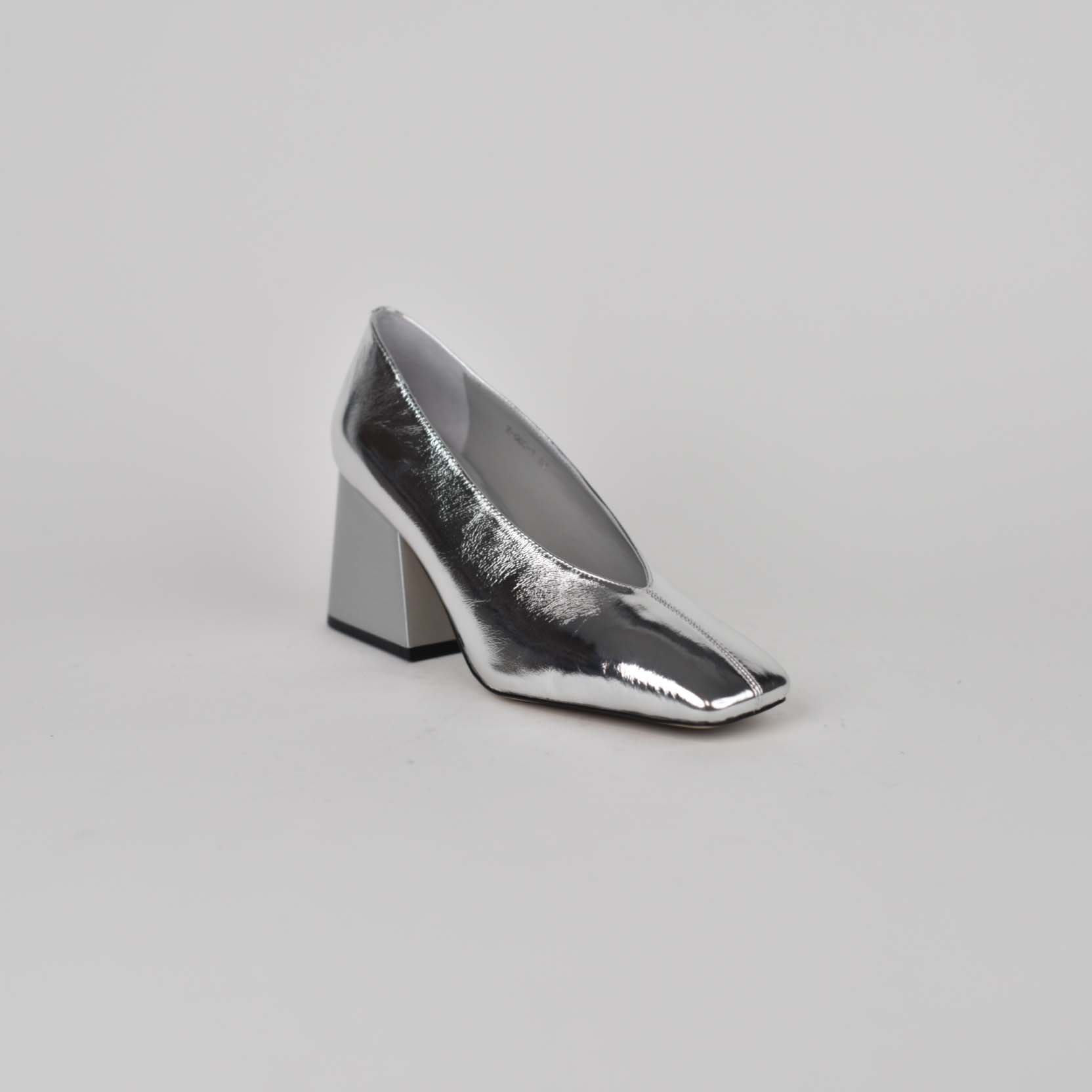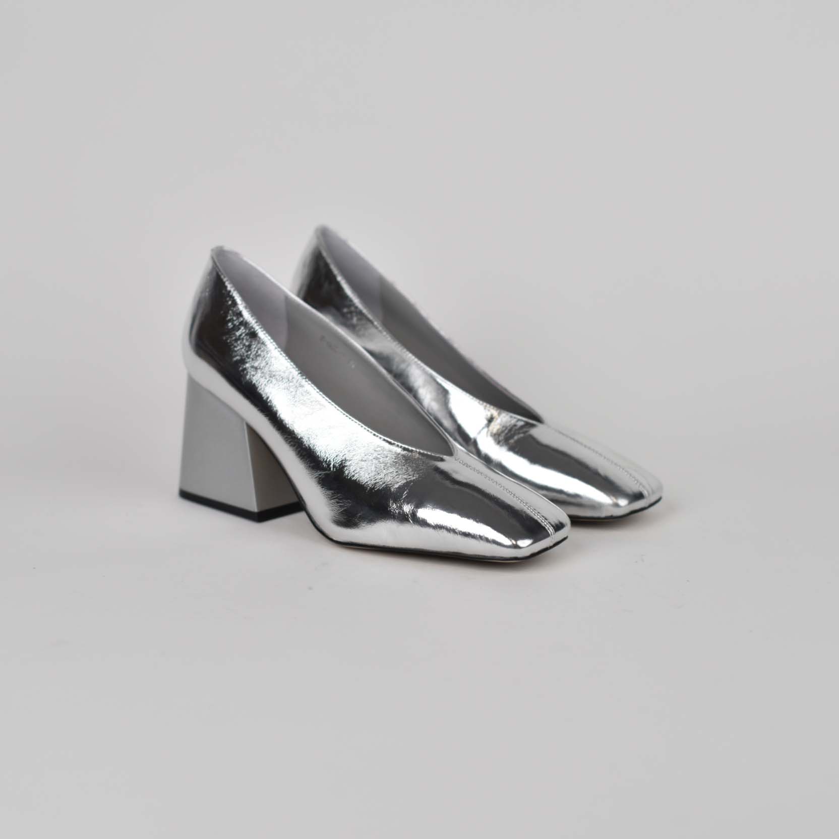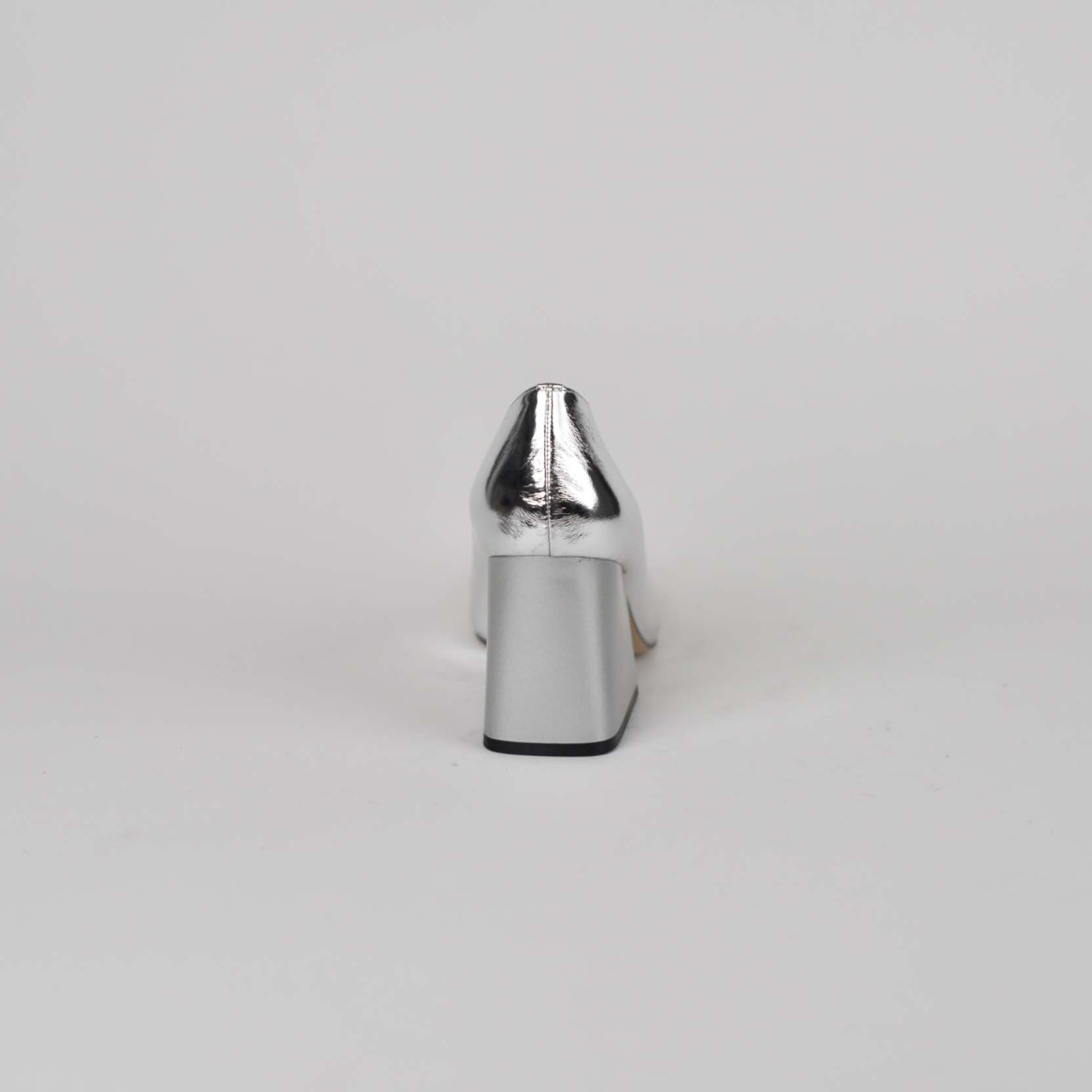 Këpucë elegante për femra, realizuar në lëkurë me efekt metalik argjendi. Model modern me majë të rrumbullakët dhe takë gjeometrike 8 cm që ofron stabilitet dhe stil unik.