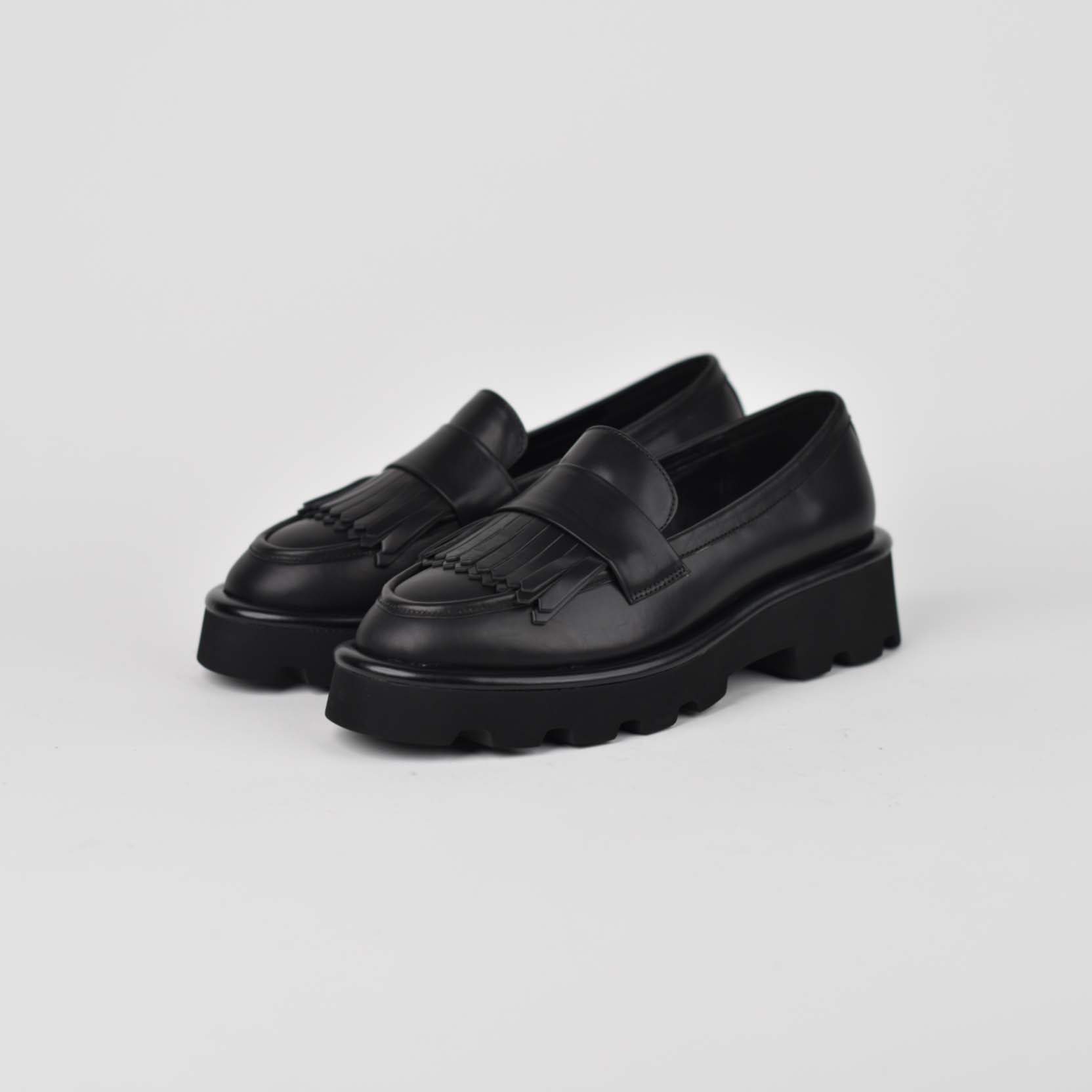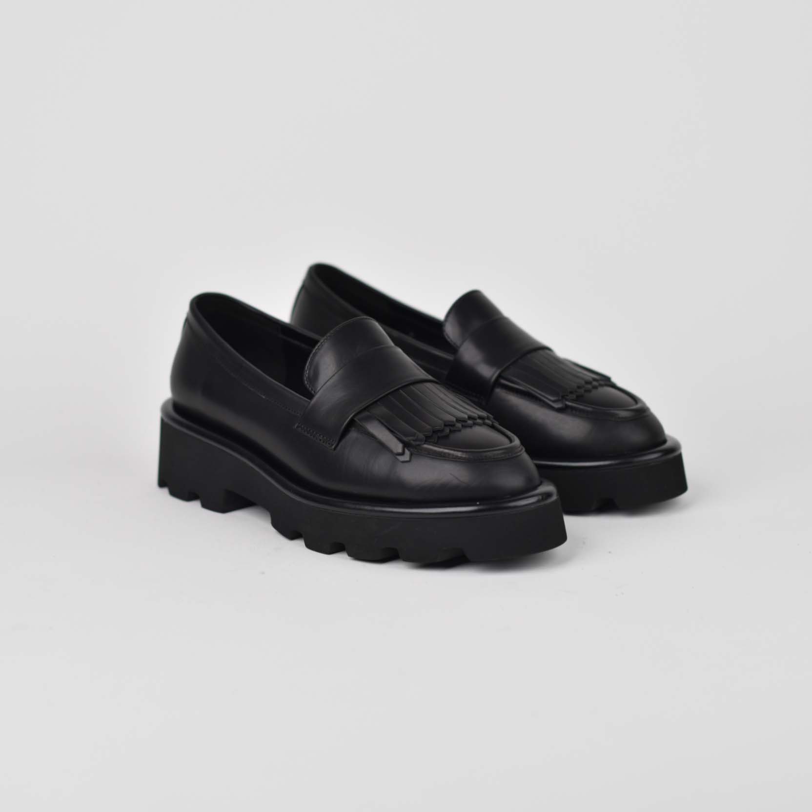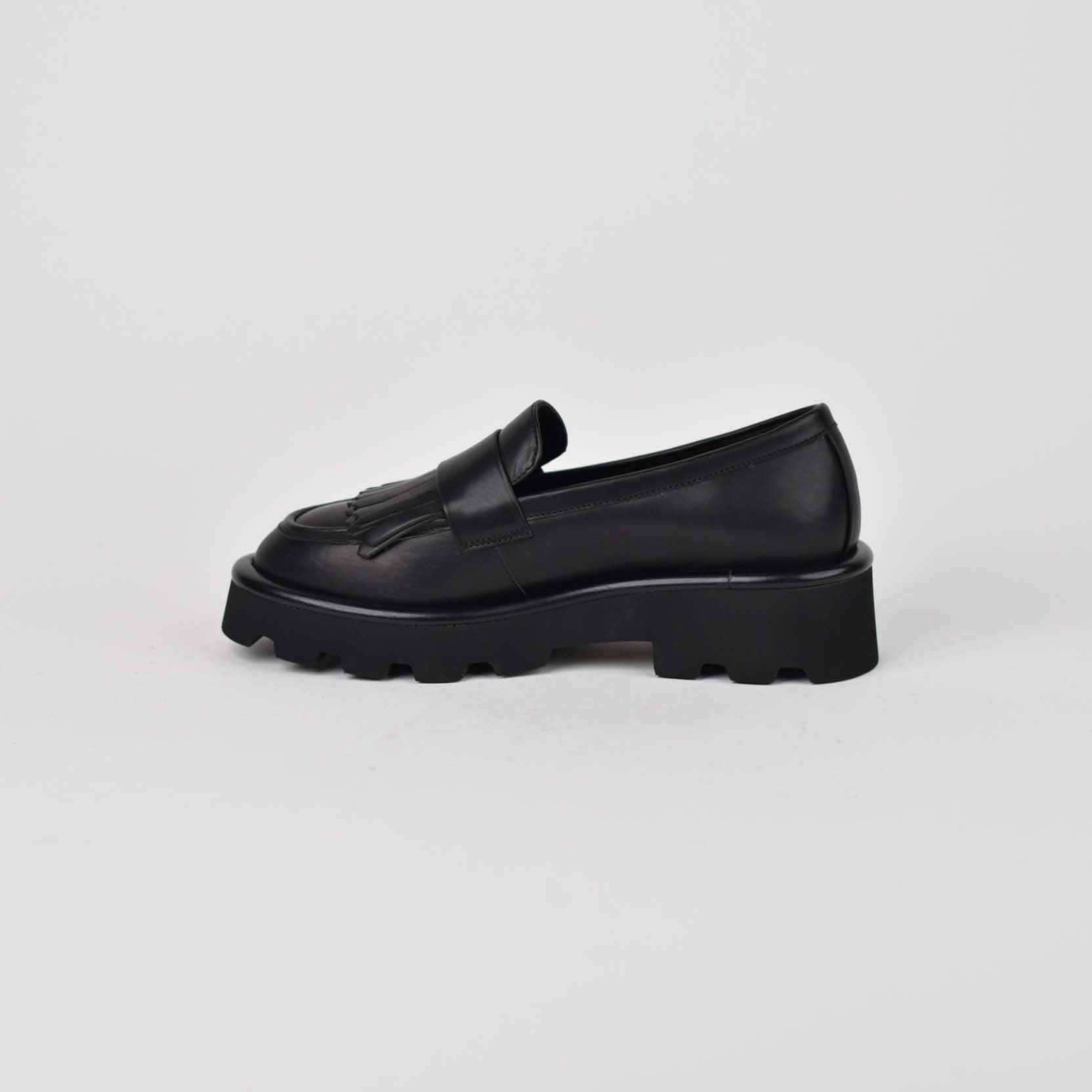 Loafers prej lëkure të zezë me dizajn modern dhe taban të trashë. Të rehatshme, elegante dhe të përshtatshme si për veshje të përditshme ashtu edhe formale. Material cilësor dhe pamje që bie në sy.