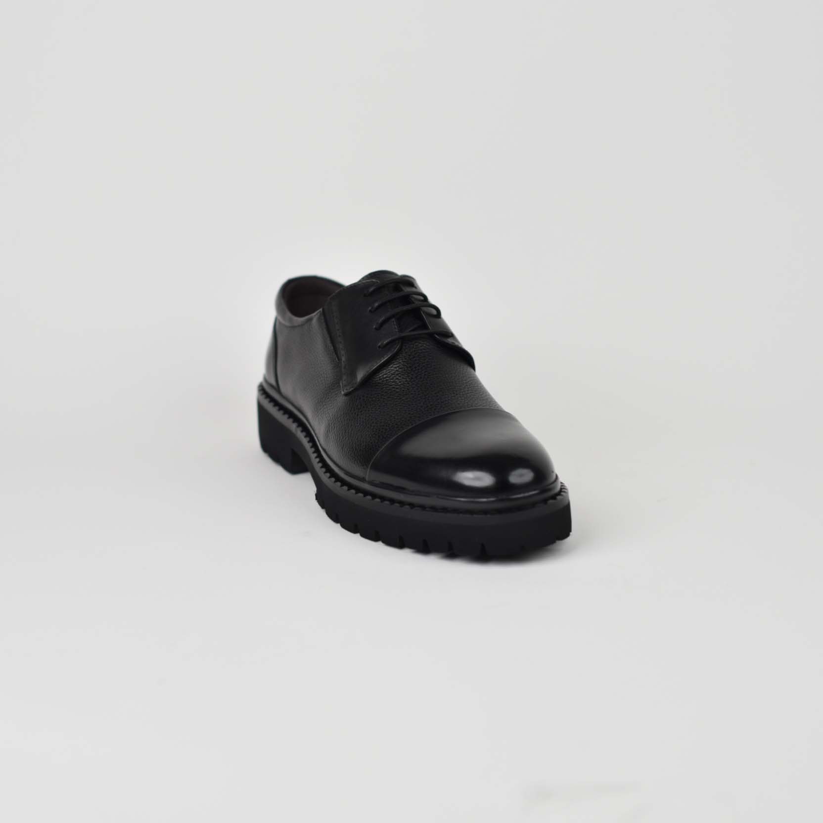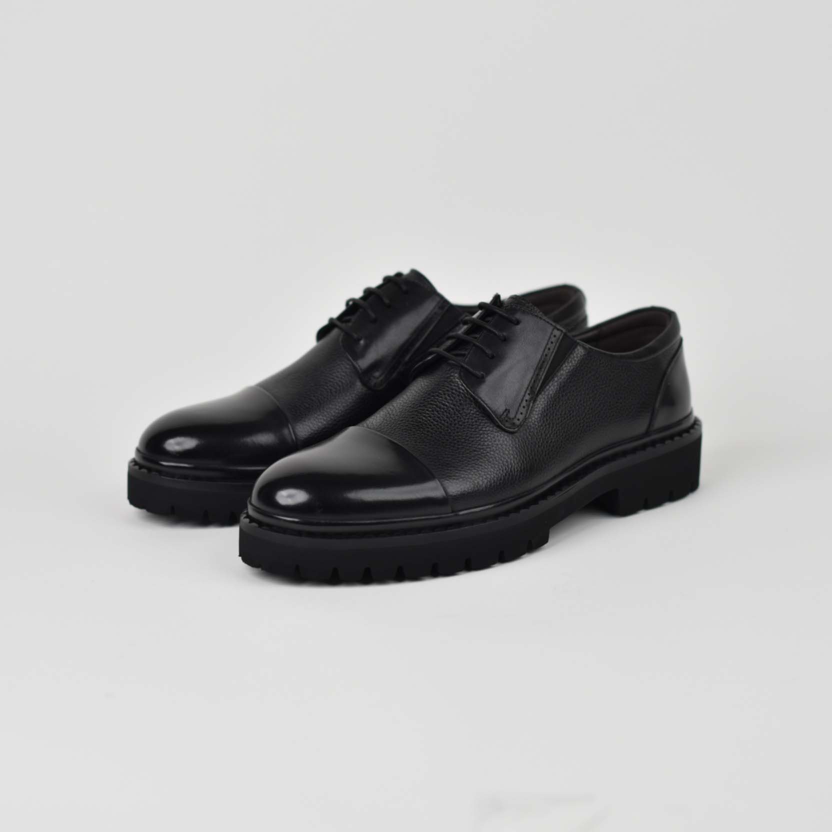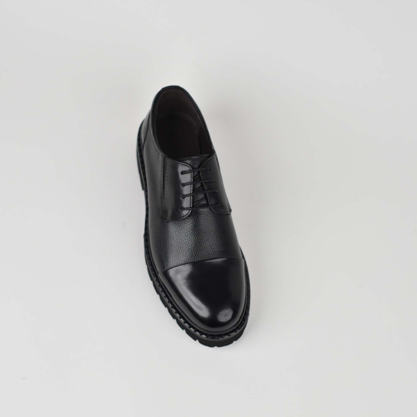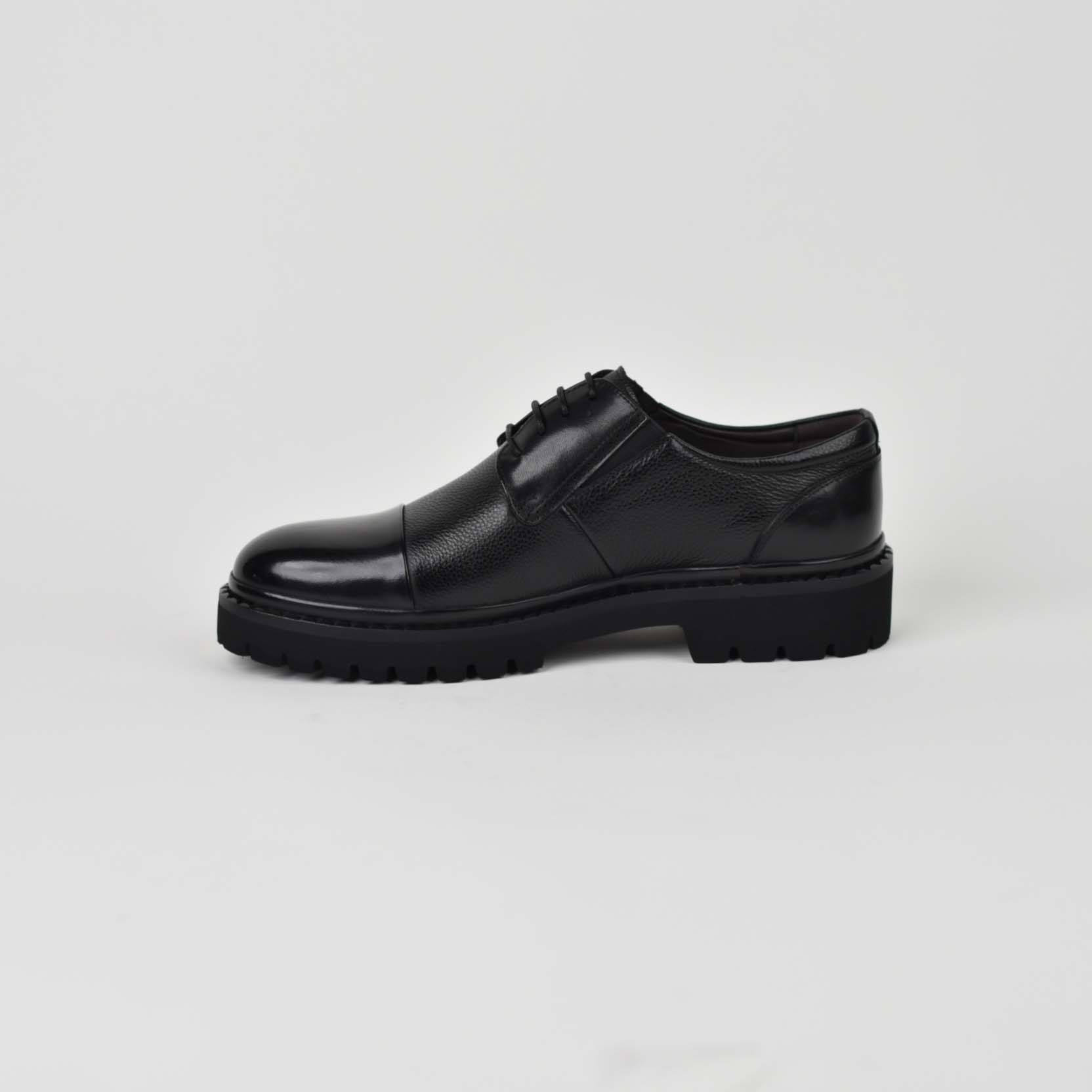 Këpucë elegante për meshkuj, të punuara nga lëkurë natyrale cilësore me strukturë të lehtë teksture, që garanton rezistencë dhe pamje luksoze. Dizajn klasik me maja të lëmuar dhe lidhëse, i kombinuar me taban të trashë antirrëshqitës për stabilitet dhe rehati gjatë gjithë ditës. Ideale për veshje formale, zyrë apo evente të veçanta.